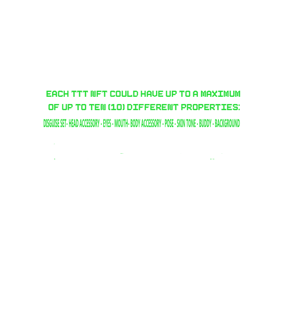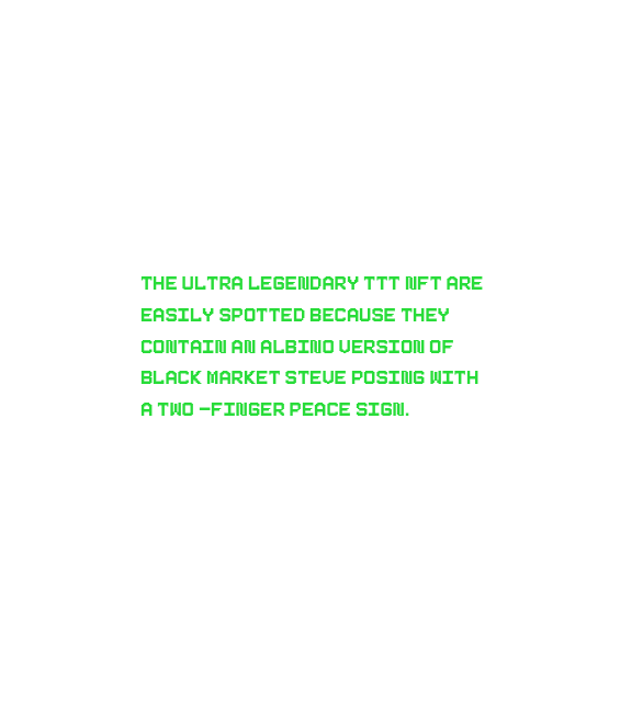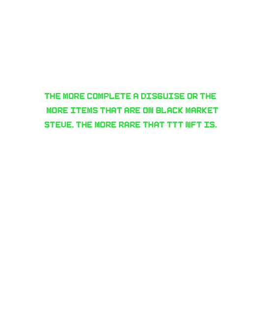 There will only ever be a total of 10,000 TTT NFTs in existance. With that said, the collection is to be split down the middle with each character personality (Steve|Rekker) are to be featured in 50% or 5,000 TTT NFTs of their own. That's not all, we took scacity to a whole new level again by implementing four additional base character poses, each totaling 1,250 TTT NFTs, ontop of the nine customary attributes already established, that are trending in today NFT marketplace. That means we have over 100+ traits for each part of the collection! |